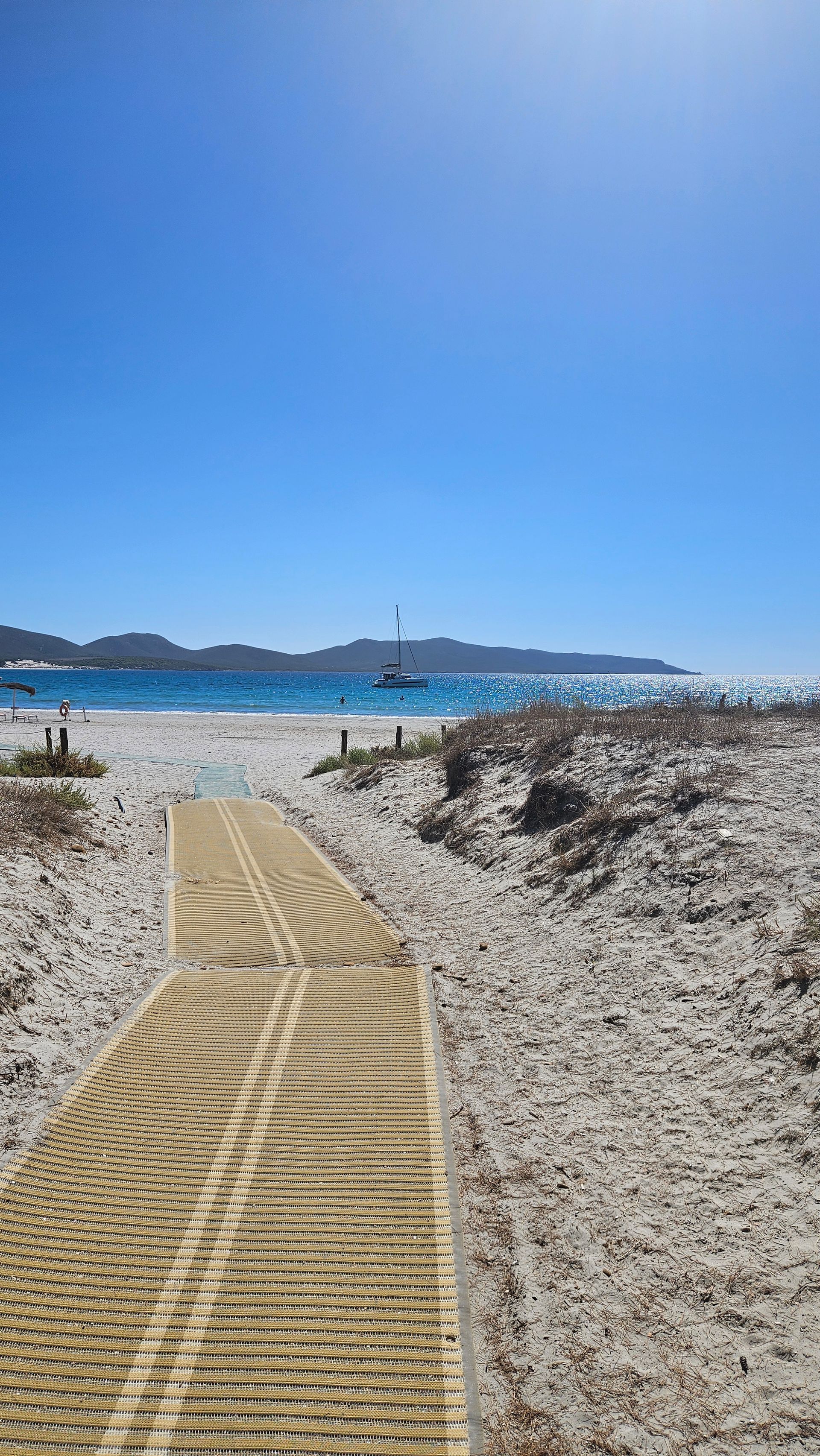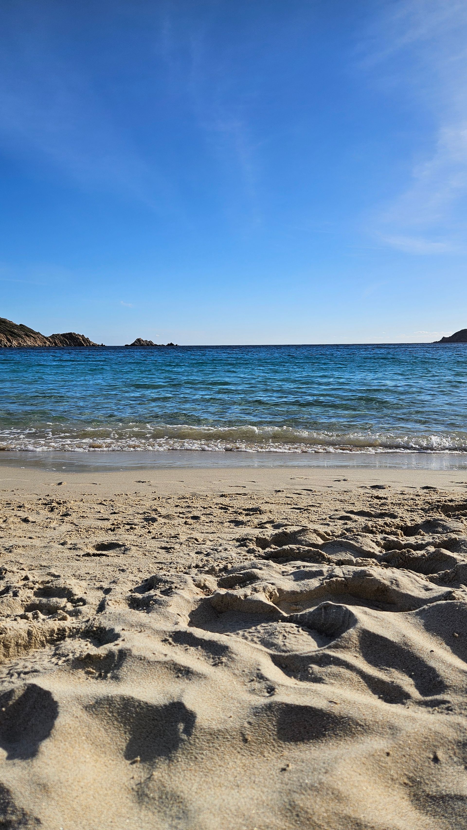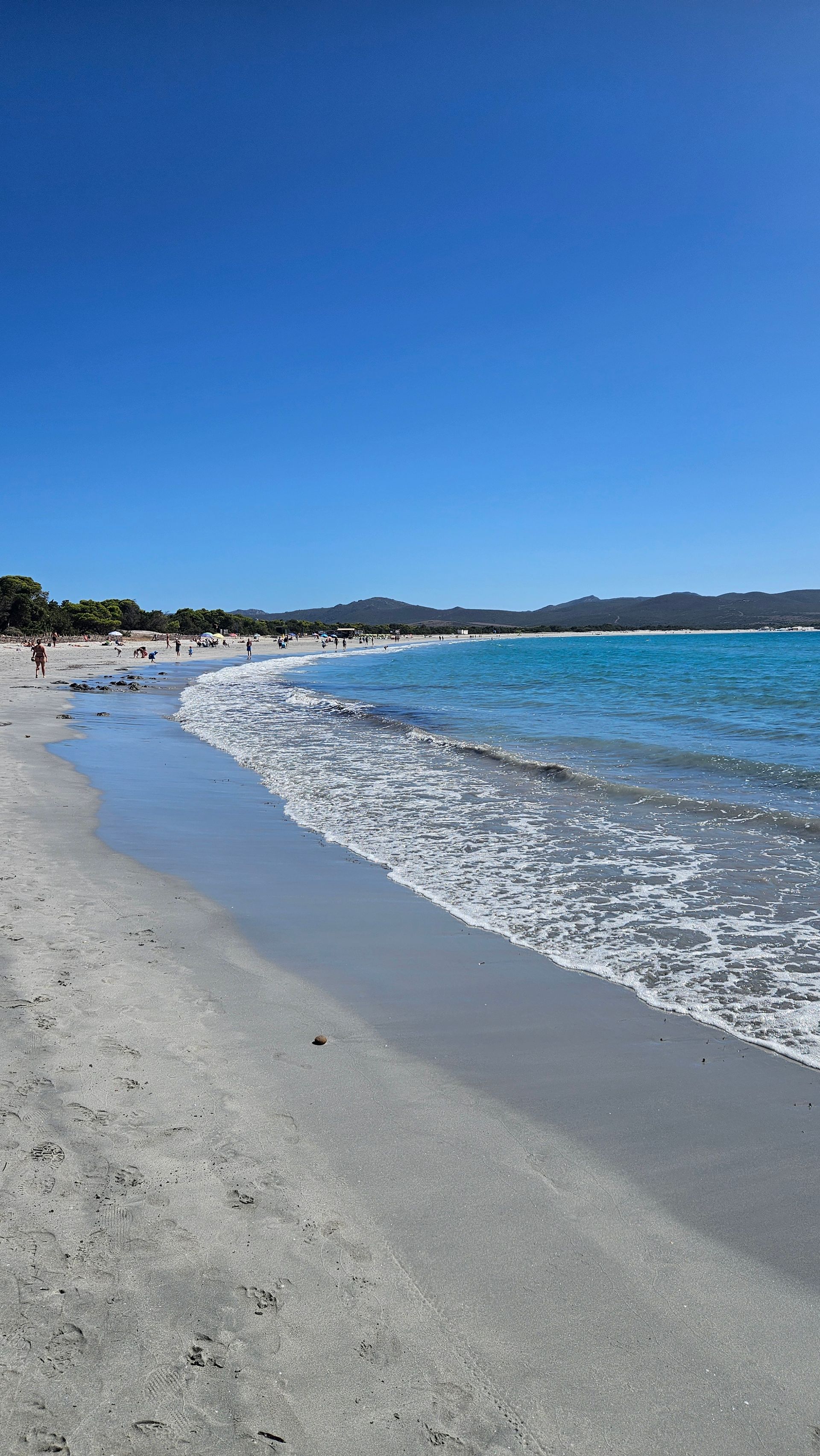 An den ersten beiden Tagen fuhren wir zum Spiaggia di Porto Pino. Die Anfahrt über eine etwas holprige Straße lohnt sich — der Strand ist weitläufig, der Sand fein und hell, und das Wasser flach und kristallklar. Vor allem: kaum andere Menschen. Ein Ort zum Durchatmen.